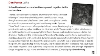 January 2016 marks the solo LP release of "Lalita." The Sanskrit term for "playfulness with life's seriousness," Lalita delves deeply into electronica synth mod layering and experimentation, along with Peretz' signature drumming. Lalita marks Don Peretz' third solo electronica release. Peretz describes the record as "a collection of hundreds of composed loops and progressions written over several years, based on observations, experiences, and ideas, distilled into 11 soundscapes."