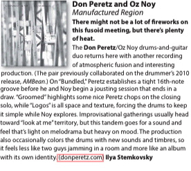 Composer and drummer Don Peretz has teamed up with Oz Noy to create the collaborative EP Manufactured Region. This five track EP exhibits a cross of fusion and electronic improvisation over the backdrop of industrial textured soundscapes. These songs show a momentary departure from NoyÕs iconic blues style, yet still maintains his personality and tone. The pieces create strong imagery and at times become trance like.